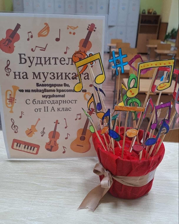 Оркестрантите получиха и подарък, сътворен от детските ръчички – кошничка с цветя от ноти . „Будителите не са само в учебниците – те са около нас!“