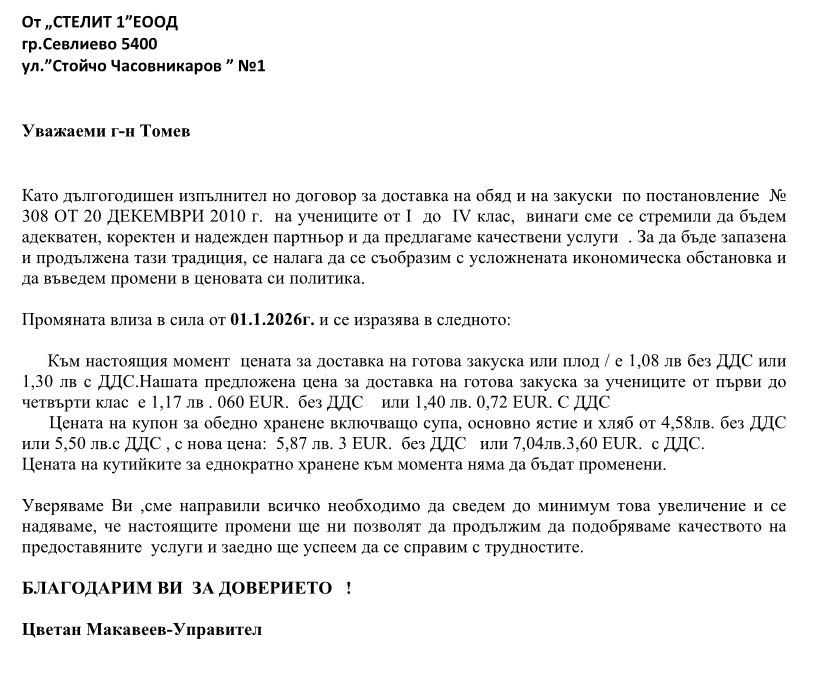 Във връзка с получено уведомително писмо на фирма „Стелит 1“ ЕООД за цената на предоставената от тях услуга, Ви информираме, че от 01.01.2026 г. цената на 1 купон е 3,60 EUR /7,04лв с ДДС. За учениците, включени в групите ЦОУД цената е 3,07 EUR/ 6,00 лв. с ДДС. За пътуващите ученици, от населено място, в което няма училище цената е 2,56 EUR/ 5,00 лв. с ДДС.
